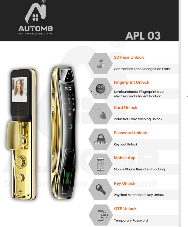 1.3D FACE UNLOCK 2.FINGERPRINT UNLOCK 3.SMART CARD UNLOCK 4.PASSWORD UNLOCK 5.MOBILE APP 6.ANYTIME VIDEO CALLING 7.KEY UNLOCK 8.OTP UNLOCK