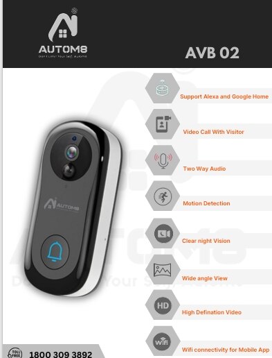 Features: 1. Support alexa and google home 2. Vide call with visitor 3. Two way audio 4.Motion detection 5. clear night vision 6.Wide angle view 7. High defination video 8. Wifi connectivity for mobile app