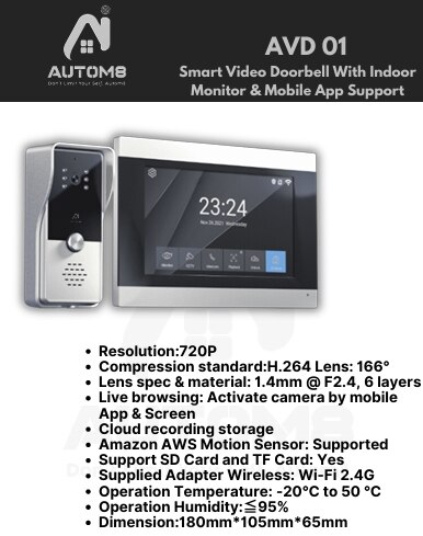 Features: 1.Resolution:720p 2.Compression standard: H.264 Lens : 166 3.Lens spec $material : 1. 4mm @F2. 4 6 layers 4. Live browising: Activate camera by mobile app $ screen 5.Cloud recording storage 6. Amazone aws motion sensor: dupprted 7. Support sd card and Tf card : yes 8. Supplied Adapter Wireless: Wi -Fi 2. 4G 9. Operation temperature : 20 c to 50 c 10 . Operation Humidity:=,95% 11. Dimension : 180mm* 105 mm* 65mm